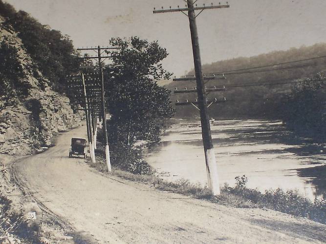 Here we see white-painted pole bases so that nighttime travellers would see (and not hit) the poles along this route and otherwise end up in the drink... It is possible the lower (6-pin) lines were for another utility. Possibly for another telephone company, electric company dispatching communications or maybe telegraph. |
