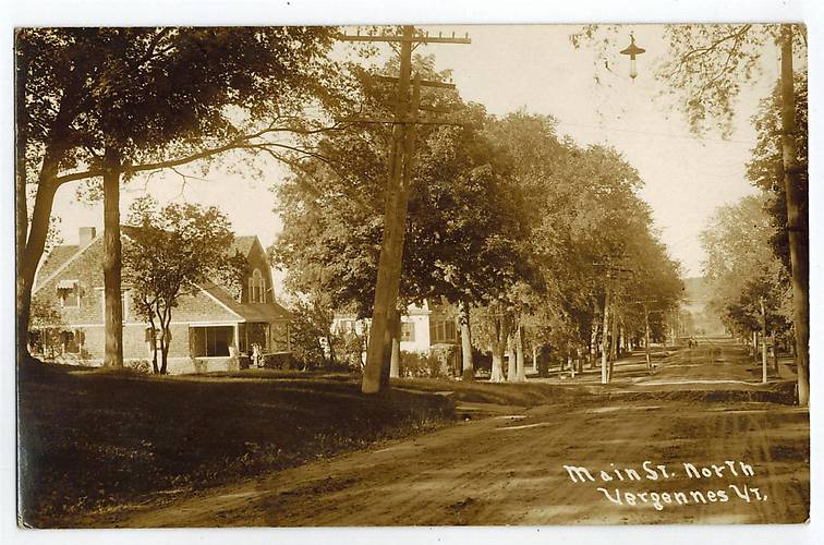 The old was meeting the new along the left side of this nice Vermont residential street. The 10-pin phone openwire construction along upon new poles was superceding the older line beneath it. On the right is an early electric arc street light that illuminated this intersection. |