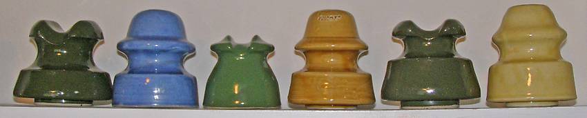 Here are six colored porcelain pieces as follows -- actual postage additional: Nice olive green cable, no markings, VNM -- $8 Awesome blue unmarked Pittsburg signal -- one skirt flake and several inner skirt flakes -- $8 Scarce bright green small cable top incuse marked PP (Porcelain Products) -- VNM -- $18 (SOLD) Nice tan signal incuse marked PINCO -- VNM -- $5 A second olive green cable, no markings, VNM -- $8 bright yellow signal marked PP (Porcelain PRoducts) on the dome -- VNM -- $10 |