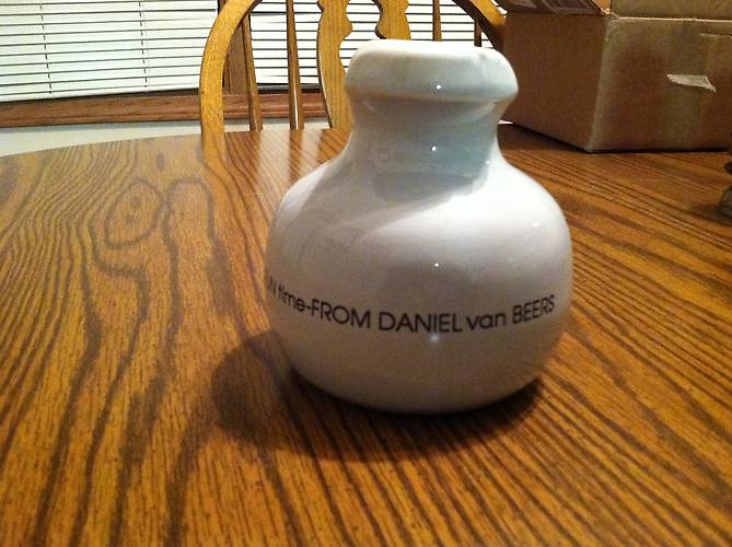 Odd fog bowl with To all My Freinds, HAVE an ALL around FUN time-FROM DANIAL van BEERS printed around the insulator.