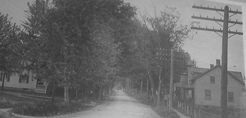 Three-crossarm telephone subscriber lead with glass insulators shining in the sunlight upon the second pole along this unpaved New York State's village's residential roadway....