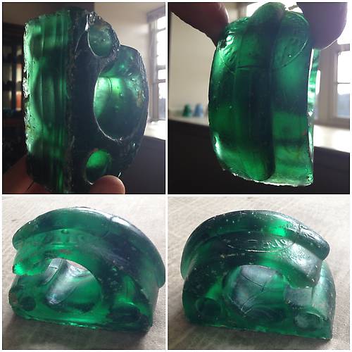 In the top pics you can see some of the amber! The bottom two pics are just sitting on the couch out of direct sunlight...very accurate of how the insulators color appears. So I have been getting feedback and two colors have dominated. Green and Emerald Green?? I would really appreciate it if someone with both colors would post a pic of them, maybe in natural light like mine, so we can all become educated on the ACTUAL difference! I'm sure everyone would appreciate it! :) From the compilation of feedback, it appears to be a nice Green-Emerald green, with a couple areas (along the top ridge) of more yellow green (not yellow green in color as a whole by any means, just in areas of the piece) bc of the amber (amber streak running down the middle top of the piece) present in those areas. Thanks for all who responded....I would still love to see a comparison picture if anyone owns the the color variations. Thanks again! |