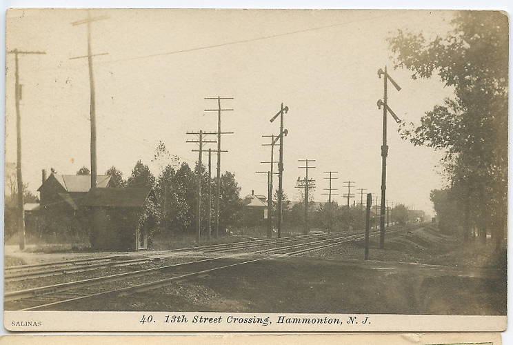 Plenty of communications open wire here! Maybe some line upgrading was going on when this photo was taken? Or perhaps competitors' routes ran along the RR tracks? You can count this as a *quadruple* bunch of total pole lines if you include the single arm line that crosses the railroad tracks (see pole on the extreme left). ;-) |