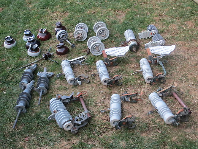 I spent some of my Thanksgiving looking for treasure in another utility dumpster. This is what I made off with. The cut outs are all made by Westinghouse except for one, which is an A B Chance. The suspensions are A B Chance and Ohio Brass bells from 1973. |