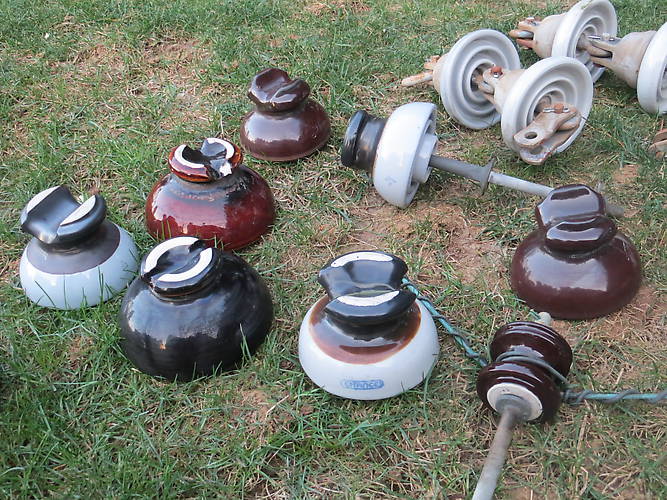 Here is a closer shot of the pintypes. The gray ones are A B Chance, NGK, and McGraw Edison, the brown ones are both Ohio Brass silent types from the 50s or 60s, The orange one is a slightly damaged Thomas from the 1940s, and the gray one is an Ohio Brass from the 1930s. |