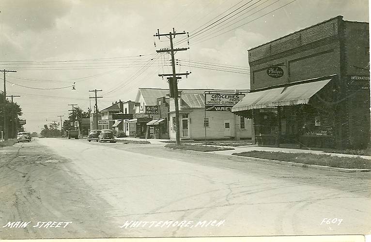 Outfitted with two tall skinny porcelain lightning arrestors atop it, this vintage pole stood in a Michigan's town centre. Also note the neat old-school electric distribution pole line construction, transformer, radial-wave incandescent span-wire street light and other utility equipment of yesteryears. PS...The old cars, store signs and other 1940s Americana look pretty sweet too ;-) |
