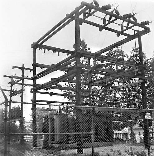 now replaced by a newer sub in the 1970s, this old one stepped down 34.5kv to 12.5kv. Pole transformers at left stepped the 12.5kv down further to 4kv for the village. White mountain Power Co. 1965 photo.