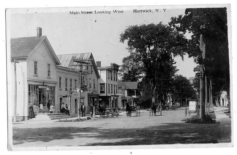 I cannot tell which poles nor wires served telephone or electric customers in this photo taken in this small New York State community. However some electricity lines were there, at least a couple to illuminate the old street light (hardly visible, but there) on the pole on the left. There certainly were plenty of insulators used within this photograph! |
