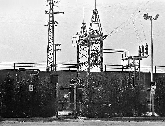 replaced by a substantially larger sub in the 1980s, coupling LILCO lines to this Municipal. 1970 photo. Long Island RR tracks in rear.