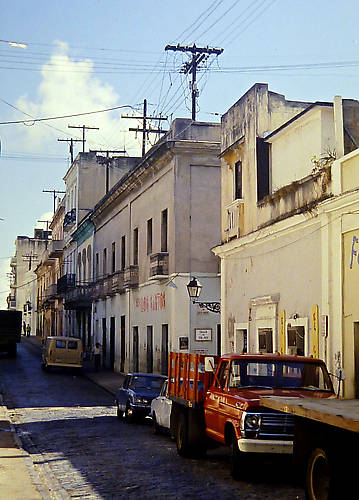 Utility poles on buildings are fairly common in this town. 1975 photo. The 4kv lines have (or at least had) glass insulators on some of the poles.