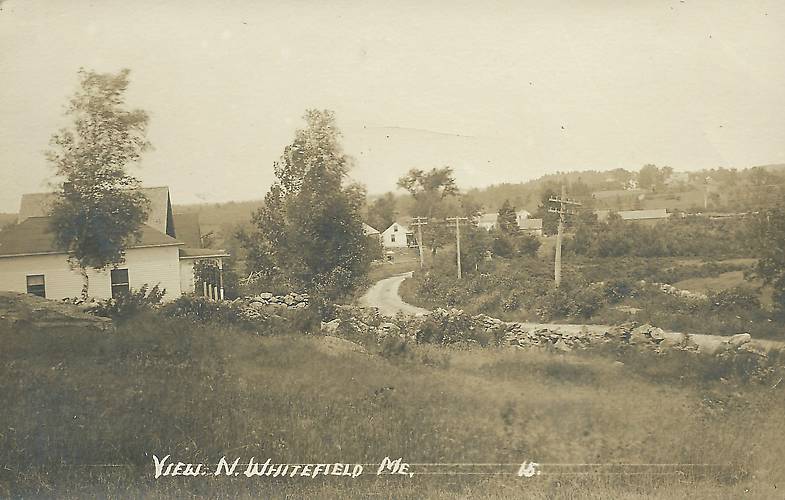 Some pretty early crossarm-style telephone subscriber openwire here in this nice country scene. This line most likely was owned by the New England Telephone and Telegraph Company in this quaint little Maine village. This is their earliest type of crossarm construction. By 1910 new construction and replacements/upgrading typically utilized 10-pin arms. |