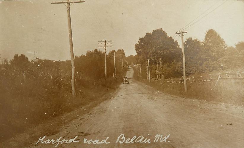 Telephone circuits ran along the left with what probably was a 4-pin line for electric lighting circuits on the right pararelling this dusty Maryland road in 1907.