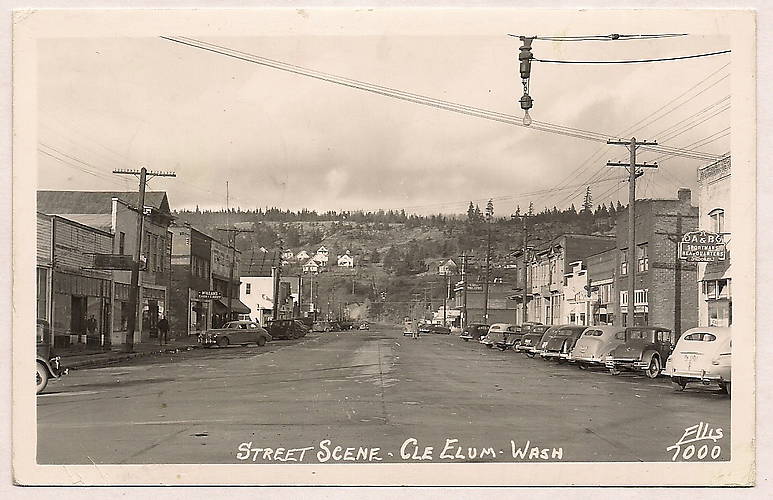 What looks like an 18-pin telephone line along the left, a spanwire street light missing its shade, electric distribution lines along the right with old cars parked complete this unposed vintage photograph of this Washington State downtown community. |