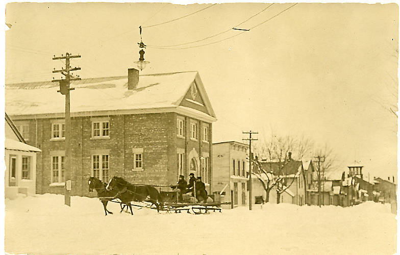 Horses pulling a sleigh beneath early electric lighting service lines are seen beneath an old arc light that surely must have looked incredibly beautiful.... vividly illuminating its intense, crisp bluish-white light ambiance surrounding all of the whiteness abound after darkness fell.... |