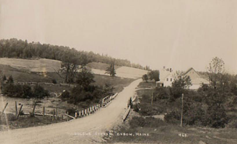 A single or double sidepin telephone line be seen extending along the right of this unpaved road with either one or two wooden side brackets upon it.