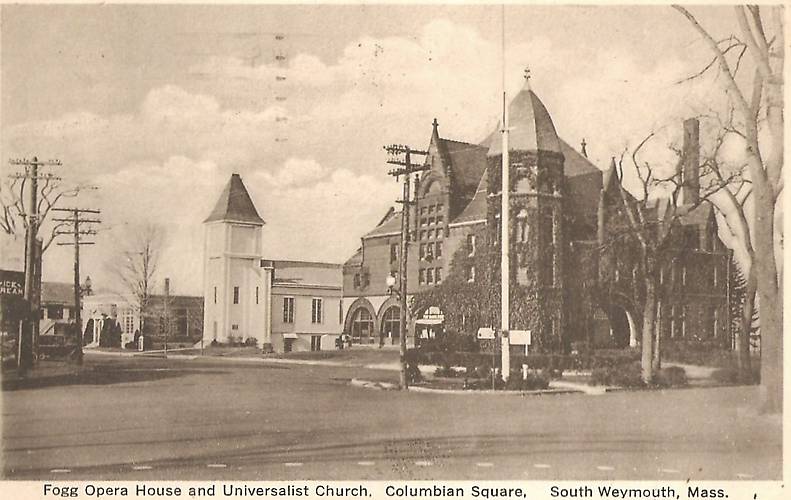 Photo taken c.1930. The utility serving this community (about 15 miles SE of Boston, MA) was the former Weymouth Light and Power Company until becoming the Massachusetts Electric Company about 1960. The latter acquired rights to using the "Reddy Kilowatt" logo, like other companies within the New England Electric System corporate umbrella. This street scene with the buildings in the background remains somewhat unchanged except that the rotary is no longer there and the utility lines have been upgraded to 1990s standards. GE Form 109 mercury vapor street lighting fixtures were installed around 1954 utilizing more energy-efficient A-H1 lamps replacing the old incandescent pole-mounted lanterns seen here. |