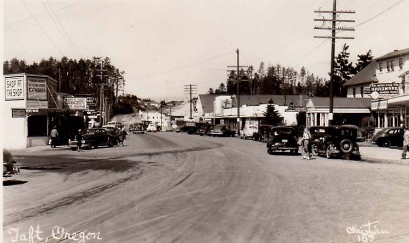 Along the right a rather classy telephone openwire line adorned with some 16 or 18-pin crossarms and transposition brackets extended through this community's business district complemented by a nice view of some old cars, store signs, etc., of the postwar day. Added note: thanks to Brent Burger...In 1965 Taft, OR and about a half-dozen adjacent burgs were combined to form Lincoln City, OR as that area is known today. |
