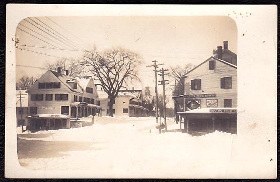 A nice view of this New Hampshire town right after a snowstorm. The (taller) pole in the foreground appears to have a two-pin fire alarm circuit atop it with telephone openwire circuits immediately beneath. Right behind (the shorter pole) is an electric lighting service pole with an old cast-iron distribution transformer on it. Way on the far left is another open wire line. Perhaps this was for telegraph service along a RR right-of-way that was known to have ran through this town. |