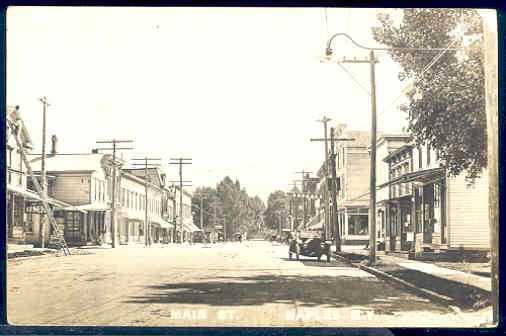 A mixture of utility lines are seen here along with a gooseneck-style incandescent street light in the foreground on the right. The bracket it was mounted on was a bit longer than standard ones (typically four feet long) so that the center roadway leading to this New York village could be adequately illuminated at night. Also note the gent taking a break atop the tall ladder on the far left;-) |