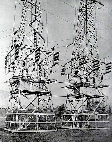 Very unusual. Lines branch off to the Colton Cement Works sub in California. From SCE Collection. Notice these stackers as insulators.