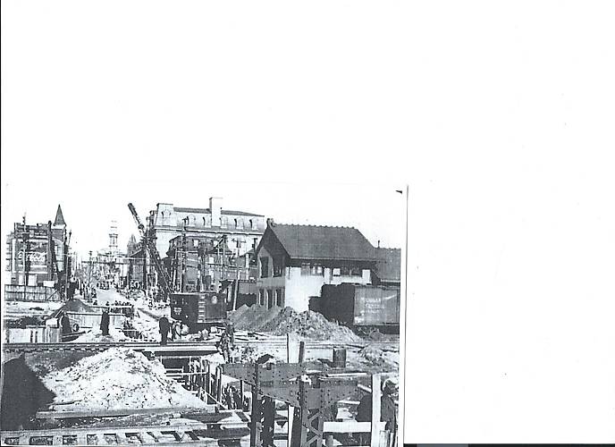 Picture taken in 1932 showing the raising of the grade to accomode an underpass. View is looking north towards Norristown on Dekalb st.. Notice 2 tracks for the Reading and 1 track for the Pennsy.