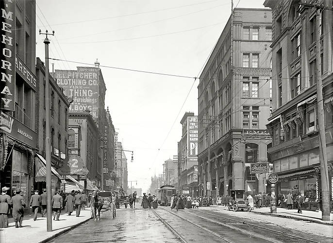 A three-pin metal crossarm bracket is seen along the left whick looks like it might have been for street lighting circuits (note the mast arm street lamp in the background extending from one of these poles). Wooden poles line the right with trolley, telephone and other utility wires. |