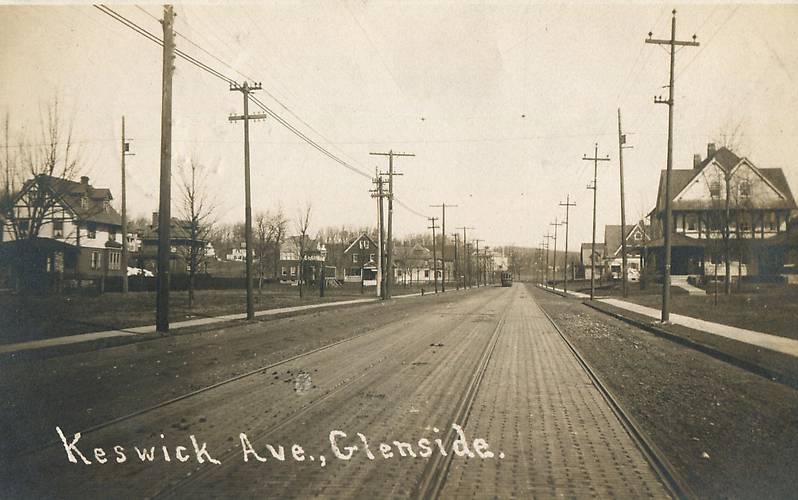 Heavy cables for trolley service extended along the left with a single-circuit, three-phase high voltage route on the right with multipart insulators upon it, once lining this Philadephia-suburban street. On the left are metal trolley crossarms with heavy-duty pintype insulators upon them. Definite treasure for Lou Hall for sure ;-) The Philly area as well as Pennyslvania and surrounding states were world-known for their steel plants. So probably metal poles were a bit less expensive than wood ones especially as we see here with heavy trolley circuits and important electric lines. |