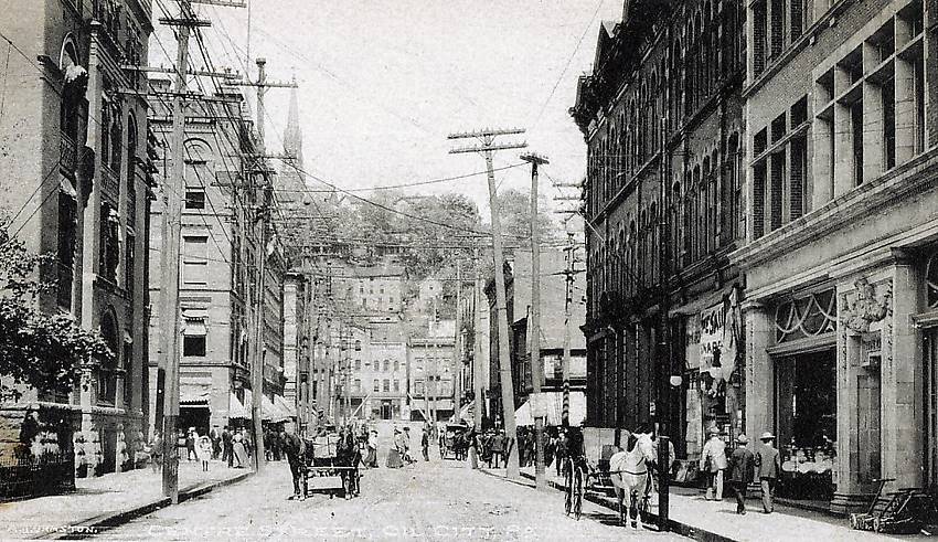 This likely is a medley of telephone, electric, trolley service and fire alarm circuits built upon these poles with their wires lining and criss-crossing the street....