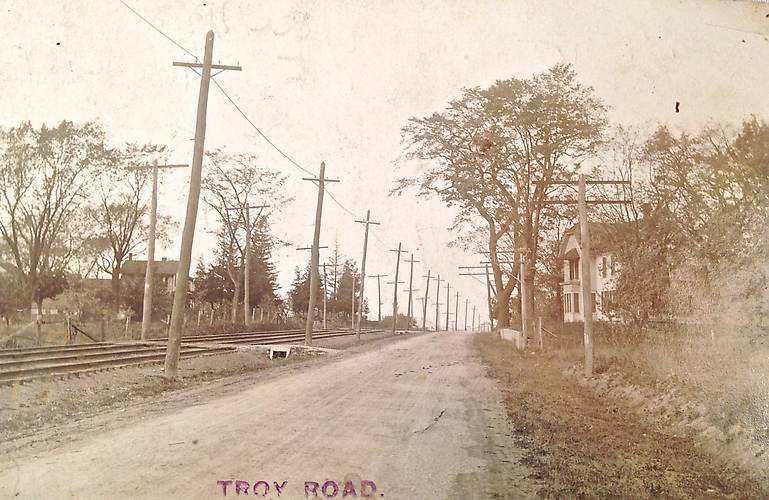 A single-circuit, three-phase electric line with glass or porcelain insulators is seen on the far left with heavy cables along the middle of this photo for trolley power. On the far right is a nice old 10-pin, two-arm telephone pole line...of the basic type we never get tired of seeing, no matter how old or new ;-) ...with "alley arms" extending over the roadway in the background for clearance from the trees to minimize electrical interference from the surrounding tree foliage, providing better telephone service. |