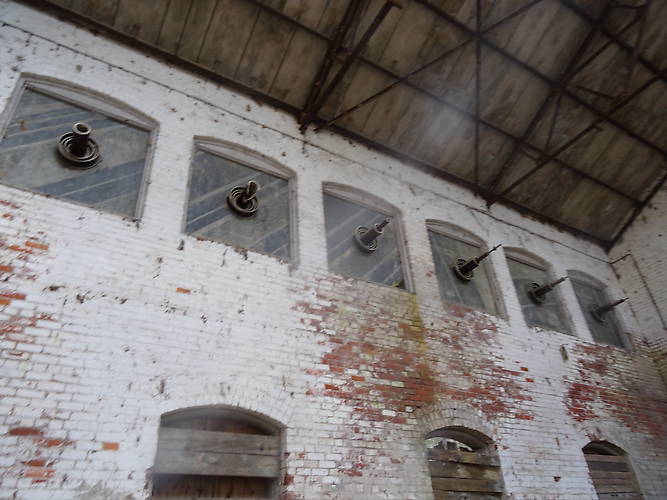 Interior of the transformer house showing slate slabs and Victor wall tubes. The ceiling is made of cement tiles with special track for easy installation. Notice the standard of Southern Power Co. in the early years were the arches over every entrance and opening for appeal and utility. |