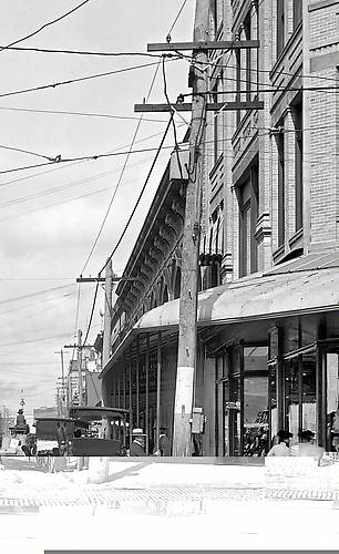 The heavier cables appearing here were for DC trolley service. A fire alarm telegraph call box is seen on the pole in the foreground.