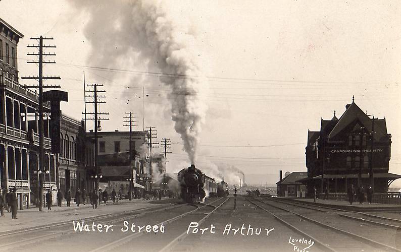 Port Arthur, Ontario Canada. Note the Canadian Northern Railway building sign on the right. Update: Kudos to one of our collector friends north-of-the-border (thanks, Ken!) Port Arthur was a village in northern Ontario. It was amalgamated with Fort William to form the present city of Thunder Bay. |