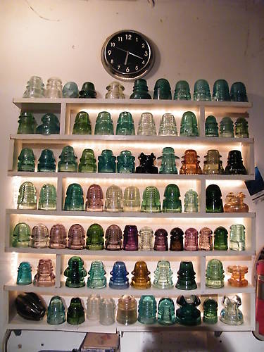 After a 2 1/2 hour ride last Saturday on Interstate 90 I found these and other insulators not shown awaiting me. Actually only the three Brookfield beehive crebs on the top shelf and all those on lowere shelves. You will find many listed in a nearby for sale picture poster gallery. And, just think, you will not even have to spend any time at all on the road through a winter wonderland. |