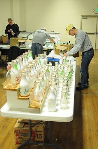 John Cleland's sales table of dairy glass items ranging from early milks to creamers.