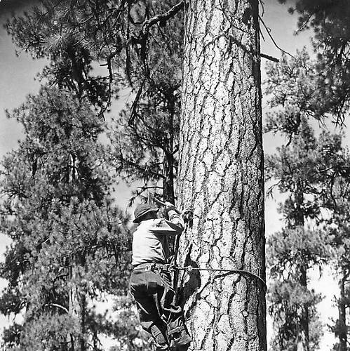 I am not certain, but it certainly looks like a spool insulator of some sort he is nailing on.
