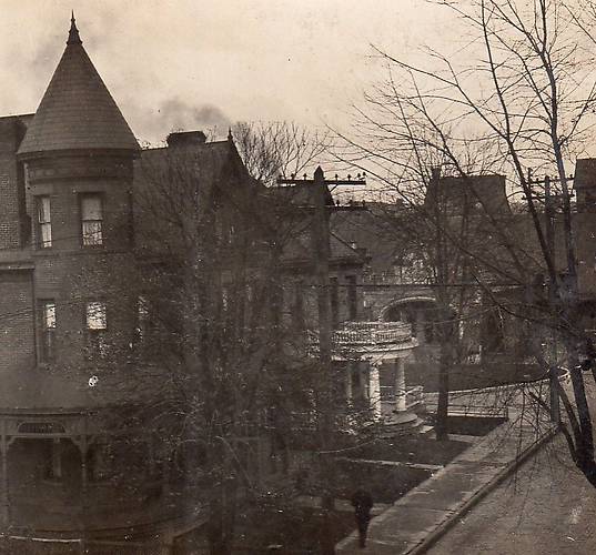 The latter sits upon the upper crossarm on a cool "pencil-top" pole. The cast iron, two-pin bracket probably was for connecting wires on each side to a series street light (not shown). Visible from this vantage point are some beautiful Victorian-era homes, notably the one on the left with a "turret top". |