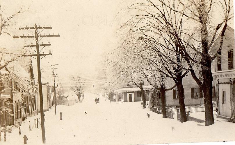 Very peaceful view of this New York State's neighborhood with ice-crust on wires, poles, trees and everything else on February 14, 1915. Can't you smell the sweet aroma of the coal and wood stoves and fireplaces that heated this locale's nice homes on that bitterly cold day? |