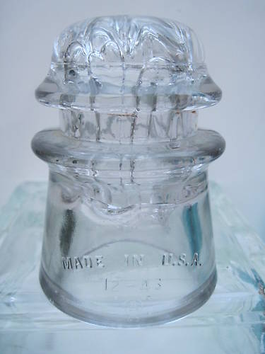 FOUND THIS IN AN ANTIQUE SHOP TODAY FOR $ 5. THE PLUNGER WAS REMOVED BEFORE THE GLASS WAS SET UP OBLITERATING THE SCREWS. IT WAS NEVER PUT IN SERVICE AS THERE IS NO WAY IT WOULD FIT ON A PIN. SO IT IS SAFE TO SAY IT WAS PROBABLY REMOVED FROM THE FACTORY BY ONE OF THE WORKERS BACK IN 1946. A FRIEND OF MINE FOUND A CD 155 WITH THE SAME PROBLEM A YEAR OR SO BACK. SO I KNOW THERE MUST BE SOME OF THESE OUT THERE. IF YOU HAVE ONE .PLEASE CONTACT ME. THANKS TO A FINE COLLECTOR FROM MILLVILLE N.J. THIS OCCURRED WHEN COMPRESSED AIR WAS FORCED INTO THE PIN HOLE WHEN THE INSULATOR WAS BEING MADE.. |