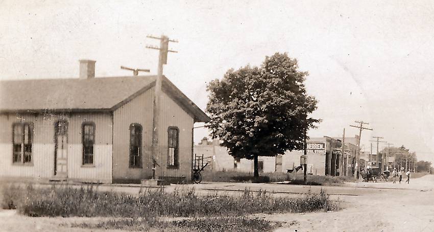 The latter provided terminals within a wood enclosure for telegraph service within the above railroad station. A good looking string of telephone and/or electric service poles is also seen along the right background heading into this Michigan village. |