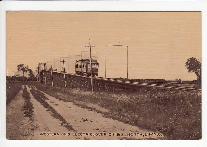 A three-phase circuit probably outfitted with porcelain multipart insulators produced in or nearby this Ohio community served this electric transit line and possibly electric lighting customers. Note the caption "Western Ohio Electric" along this image's lower edge. |