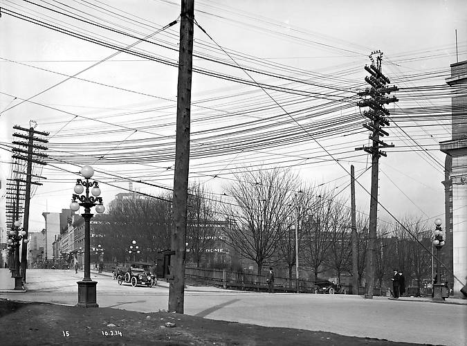 in Vancouver with streetlights and old style power poles,1914.