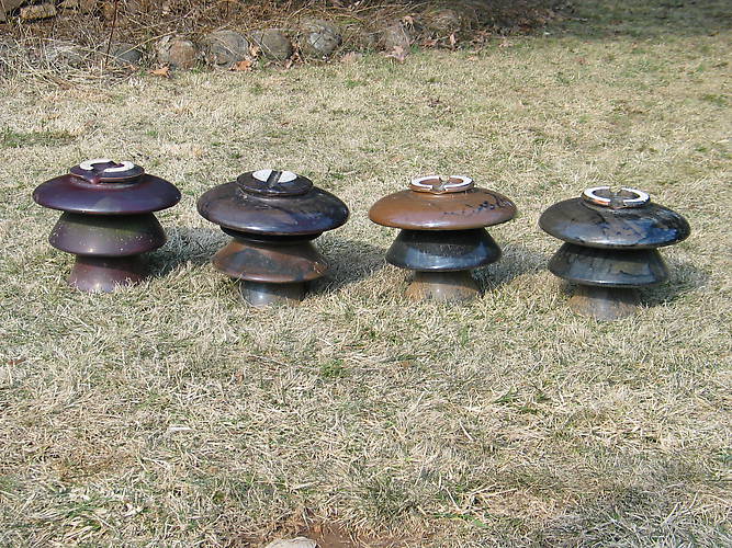 4 large porcelain power pieces with attractive multi color drippy glazes. The one on the far left is a Locke marked with an insulator and R=8, the next one could be a Thomas of Westinghouse. I honestly don't know. The 2 on the end are likely Ohio Brass. I use these for outdoor decoration. i.e. random placement in a flower bed, flanking the ends of steps or patio finials instead of something predictable like Grecian urns. I've paid on average $15 - $25 each for these (in general) when I am lucky enough that someone has brought them along to a show. I am offering these for $20 each delivered to the Enfield, CT show Sunday March 30. I will only bring them upon request so if you are interested, please let me know. I am willing to transfer to someone else provided that it is agreed upon prior to the show. |
