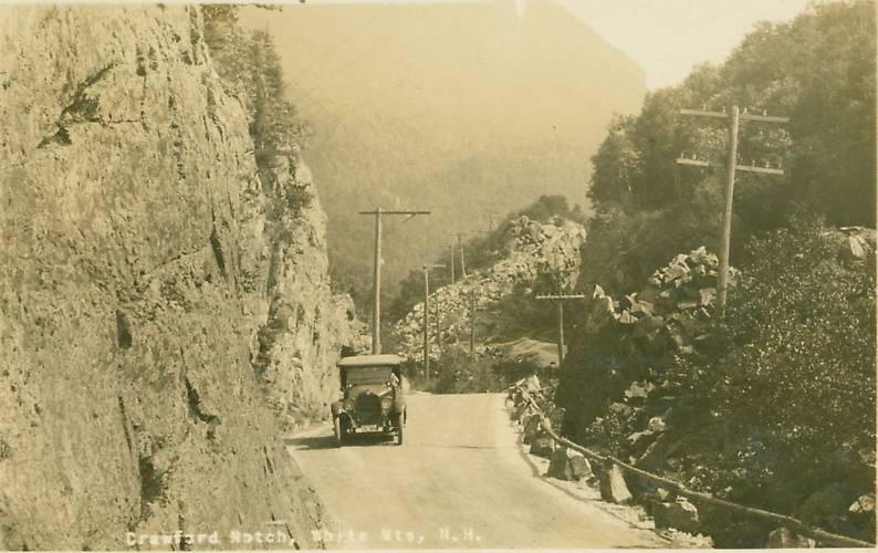 A nice vintage automobile of the day is stately parked in the foreground within the famous "White Mountains" of scenic New Hampshire.
