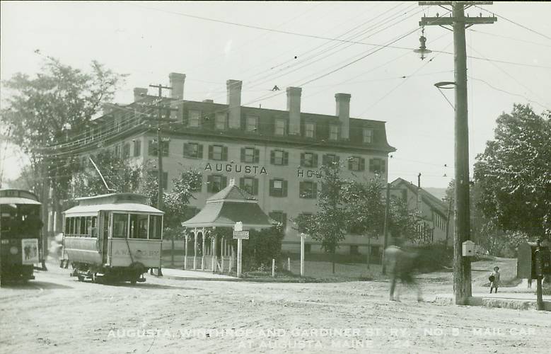 Augusta, ME c.1925, Trolley, Electric Lines, Fire Call Box