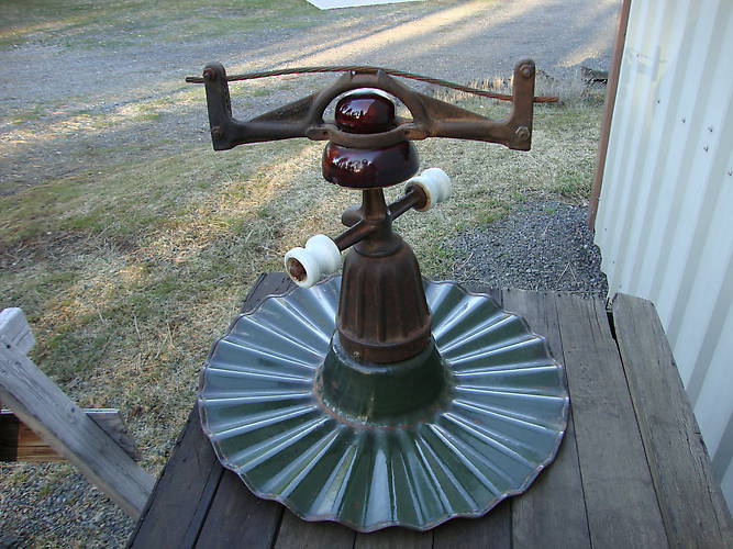 Found this early electric street light at an antique mall on the way to the Seattle show. I was told it was used on the Great Northern Railway at a fruit packing plant in Cashmere, Washington. It still has an original section of cable attached that it hung from. |