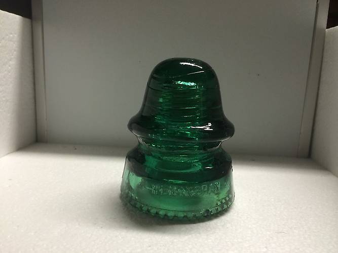 A very nice, solid dark green Hemingray No 19 in VNM condition a few shaved/chips drips (including a few that didn't fill in all the way) This is a SOLID green, not amber swirled aqua, very tough piece $250 plus shipping and insurance