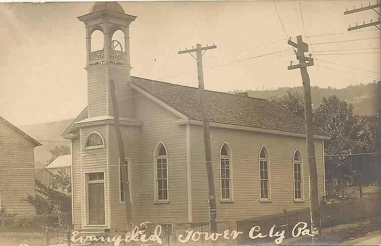 The latter is on the right with a portion of telephone openwire lead seen beyond it in the upper right corner of this image. A six-pin pole in front of the church might have been for comms or electric utility use.
