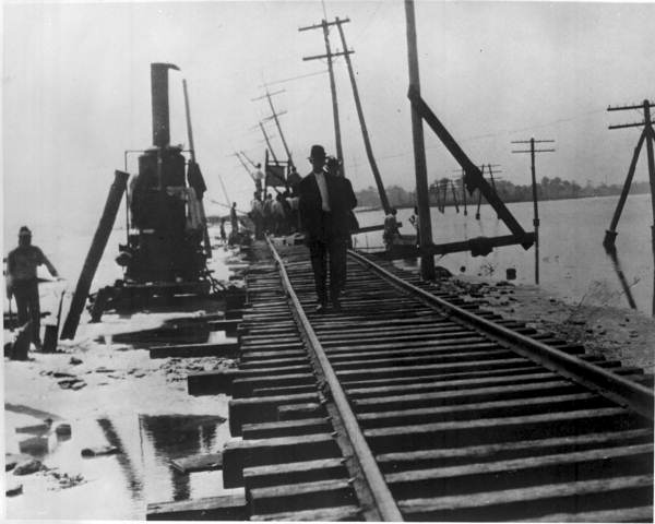 A hurricane or the like apparently wreaked some havoc in this vicinity with crews making repairs. A double arm, 10-pin telephone openwire line extended along the right crossing this waterway. Note the fortified poles and supporting ones having partially exposed heavy-duty concrete footings! |