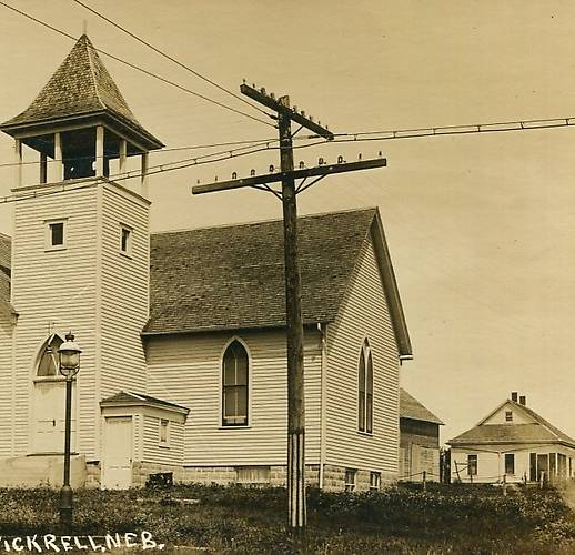Complemented by twisted pair cable supported by bridle rings, supplementing telephone service circuits in this Nebraska community a century ago. Added note: The wires were actually deadended on each of these single 90-degree-mounted crossarms. Typically (and by most standards) double "buck" arms were used in such installations. Thanks Brent B. for pointing this out and for the info ;-) |