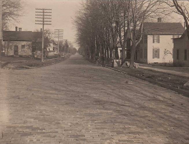 A great looking tall 10-pin, 6-crossarm telephone line went down this street complemented by some very nice old homes too ;-)